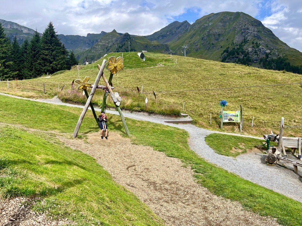 Once we arrived in Murren, we explored the town a bit and made our way up to the Allmendhubel station. It is here that you can take the funicular railway up to an amazing children’s playground. The kids had such as blast playing here as there are numerous fun activities to do such as a zip line, tunnels to climb through, a water labyrinth, swings and slides. We spent a good hour or two playing at the park. There is also a restaurant next to the playground where you can either dine inside or outside. They have different options for food and beverages. My wife and I were able to enjoy some coffee while the kids were playing.