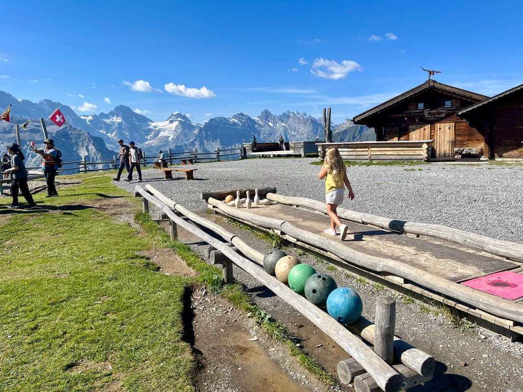 We then made our way back down to the Mannlichen cable car station and then continued further until we arrived at the Mannlichen Restaurant and playground. It was still mid-morning at this point so the kids played for quite a while. There was a tall slide that was hidden inside a 2 story cow as well as multiple swings and climbing equipment. You could even take your turn bowling!