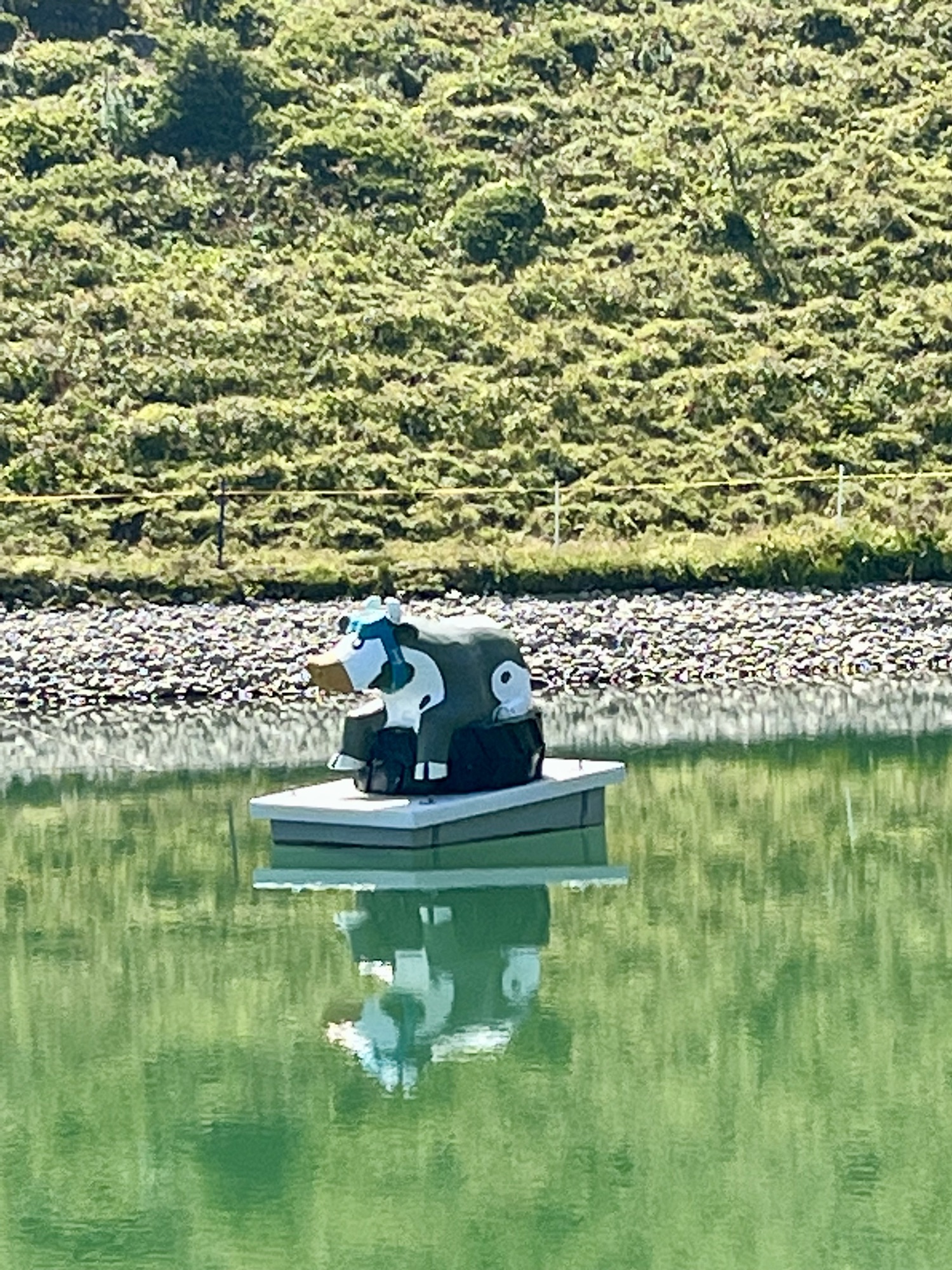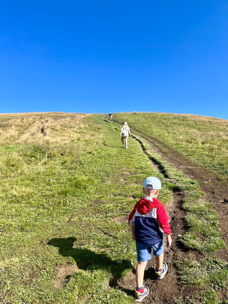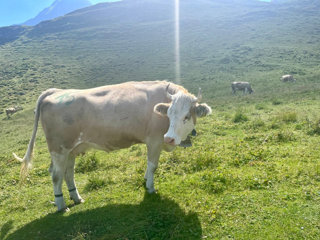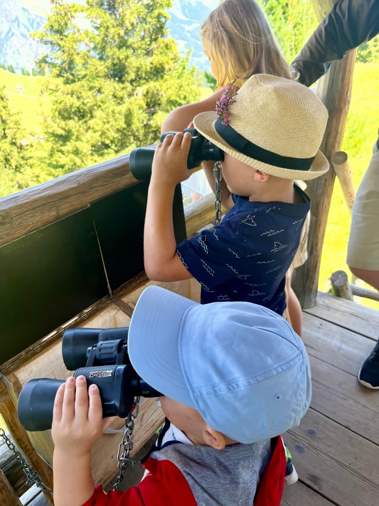 Some of the trail activities included ringing a cow bell, using binoculars to try to find marmots, a long jump, and playing an alphorn. We loved this trail! It was so easy to keep the kids engaged as they were always ready to go to the next station and see what was in store for us next and they really wanted to get each of the letters stamped on their guides to get their prize at the end. We were also able to pass by cows grazing in the mountain pasture which was pretty neat.
