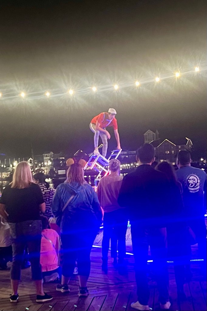 We have made our way over to Disney Boardwalk area multiple times on our DIsney World Vacation. There are many different things to do in this area including renting a Surrey bike to peddle around Crescent Lake as well as playing mini-golf at Fantasia Gardens and Fairways Miniature Golf. There is also lots of entertainment along the Boardwalk especially at night. We have seen magicians, jugglers, as well as a jump rope performance. There is plenty to eat and drink in this area as well with sit-down restaurants, such as Flying Fish and Trattoria al Forno, take-out food at the Boardwalk Deli and the Pizza Window, as well ice cream and even a margarita stand.