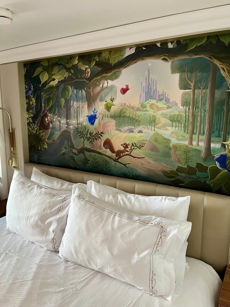 One of the most fun parts of booking your Disney cruise is choosing a room theme. The Disney Wish features themed staterooms based on popular Disney movies such as Cinderella, Frozen, Sleeping Beauty, Moana, and The Little Mermaid. We were drawn to the Sleeping Beauty room, as it’s a favorite of our whole family.